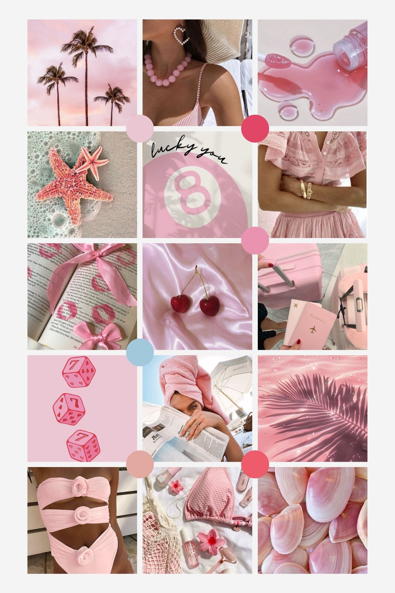 Color Crush: Soft bubblegum pink, dreamy blush, vibrant coral, bold raspberry, delicate ivory, serene sky blue, muted moonlit gray.